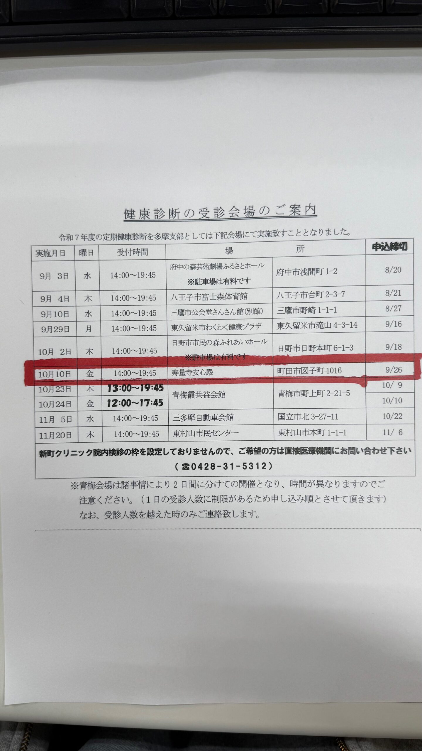 ☆健康診断について☆ 10/10(金) 寿量寺安心殿にて 14時~19時45分 2025年10月7日 ALLお疲れ様です。標記の日程で健康診断を実施いたしますので再度ご確認に程お願い申し上げます。当日の注意事項等ございますので皆様お気を付けください。こちらから「閲覧した」を登録してください。選択してください清和荒木宮前田ビノンド清水神山嶋村平石室矢荻野岩永荒井阿部(健)引田伊藤(諒)原甲斐碩市村山田(玲)城所阿部(長)山田(圭)庄司紀井伊藤(里)春原清和10/7荒木10/12宮10/9前田10/8ビノンド10/7清水10/7神山 嶋村 平石 室矢 荻野10/7岩永10/8荒井10/7阿部(健)10/8引田10/7伊藤(諒)10/8原10/8甲斐10/8碩10/8市村 山田(玲)10/9城所 阿部(長) 山田(圭) 庄司10/8紀井 伊藤(里)10/7春原 すべての投稿を見るトップページへ戻る