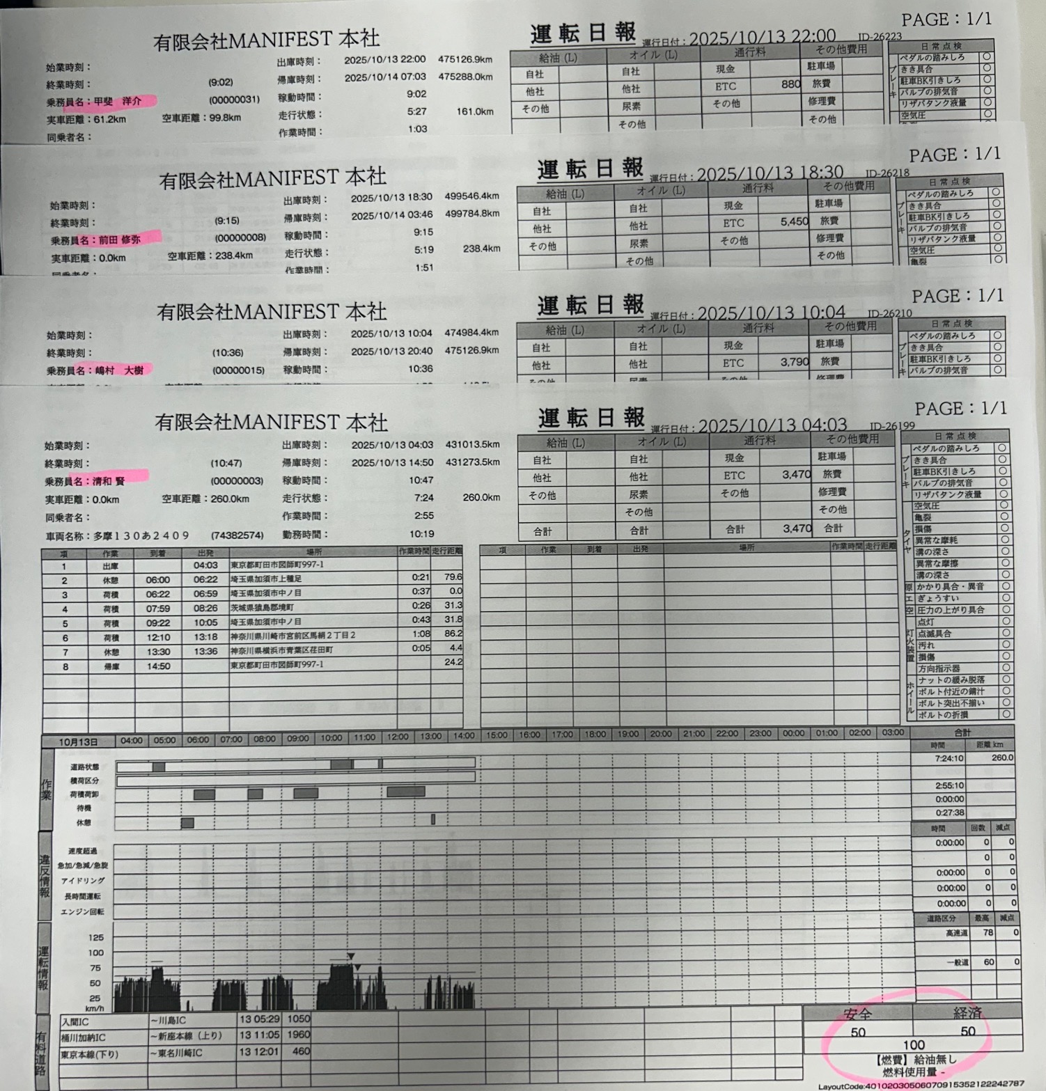 10/13分 100点満点者 4名 2025年10月14日 デジタコ(日報)お疲れ様です。上記の4名の方々が100点満点でした。いつも安全運転ありがとうございます。引き続きよろしくお願いいたします。こちらから「閲覧した」を登録してください。選択してください清和荒木宮前田ビノンド清水神山嶋村平石室矢荻野岩永荒井阿部(健)引田伊藤(諒)原甲斐碩市村山田(玲)城所阿部(長)山田(圭)庄司紀井伊藤(里)春原清和 荒木 宮 前田10/15ビノンド 清水10/14神山 嶋村 平石 室矢 荻野 岩永 荒井10/14阿部(健)10/21引田10/14伊藤(諒)10/15原10/14甲斐10/15碩 市村 山田(玲)10/14城所 阿部(長) 山田(圭) 庄司 紀井 伊藤(里)10/15春原 すべての投稿を見るトップページへ戻る