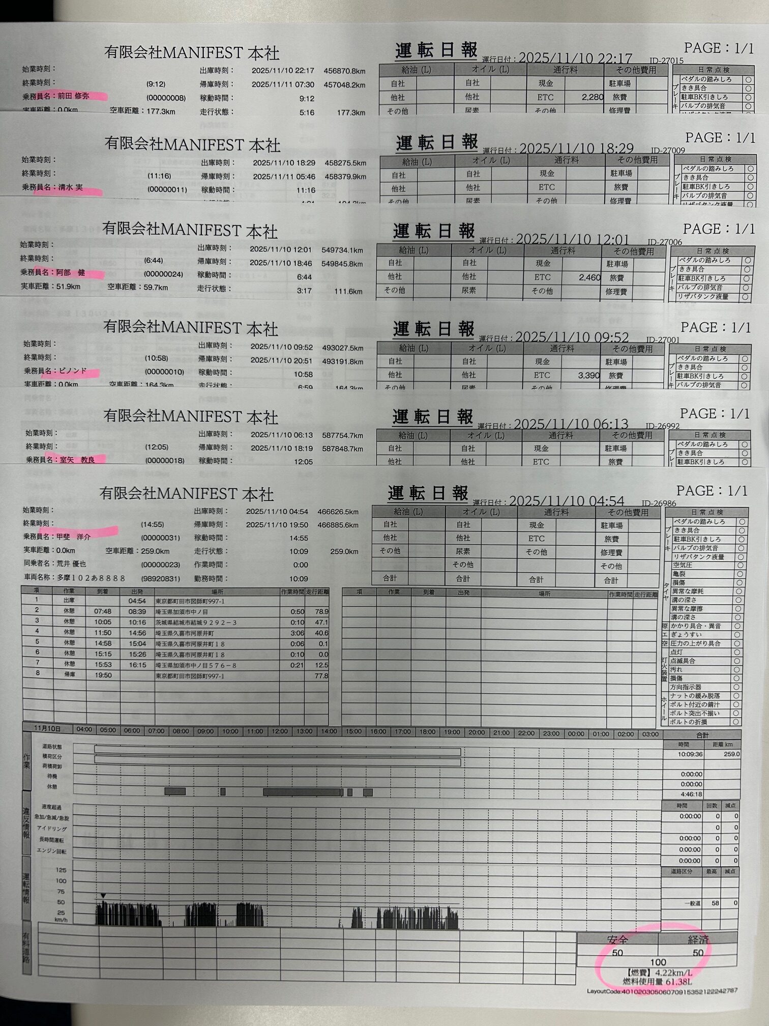 11/10分 100点満点者 6名 2025年11月11日 デジタコ(日報)お疲れ様です。6名の方が100点満点でした。いつも安全運転ありがとうございます。引き続きよろしくお願いいたします。こちらから「閲覧した」を登録してください。選択してください清和荒木宮前田ビノンド清水神山嶋村平石室矢荻野岩永荒井阿部(健)引田伊藤(諒)原甲斐碩市村山田(玲)城所阿部(長)山田(圭)庄司紀井伊藤(里)春原清和11/11荒木 宮 前田11/14ビノンド 清水11/11神山 嶋村 平石 室矢 荻野11/11岩永 荒井11/11阿部(健) 引田 伊藤(諒) 原 甲斐 碩 市村 山田(玲) 城所 阿部(長) 山田(圭) 庄司 紀井 伊藤(里)11/11春原 すべての投稿を見るトップページへ戻る