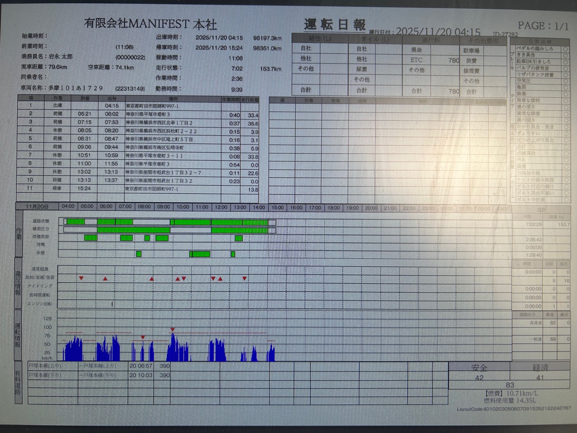 速度超過、急加速、急減速、長時間運転などに気を付け90点以上取れる安全運転で無事、帰って来れるようお願いいたします。