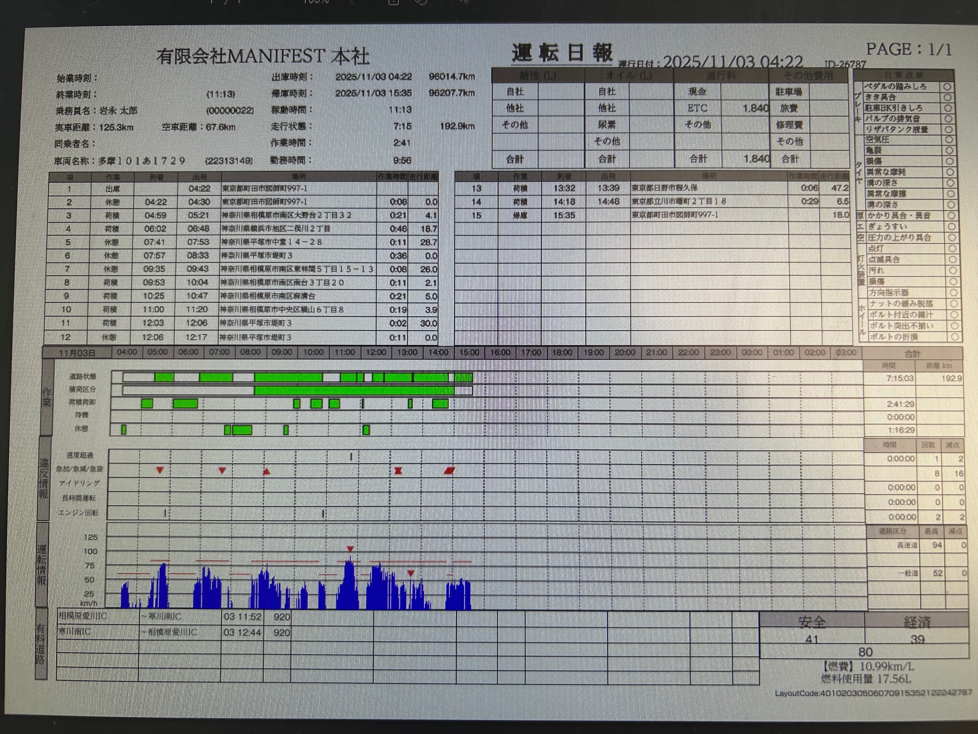 速度超過、急加速、急減速、長時間運転などに気を付け90点以上取れる安全運転で無事、帰って来れるようお願いいたします。