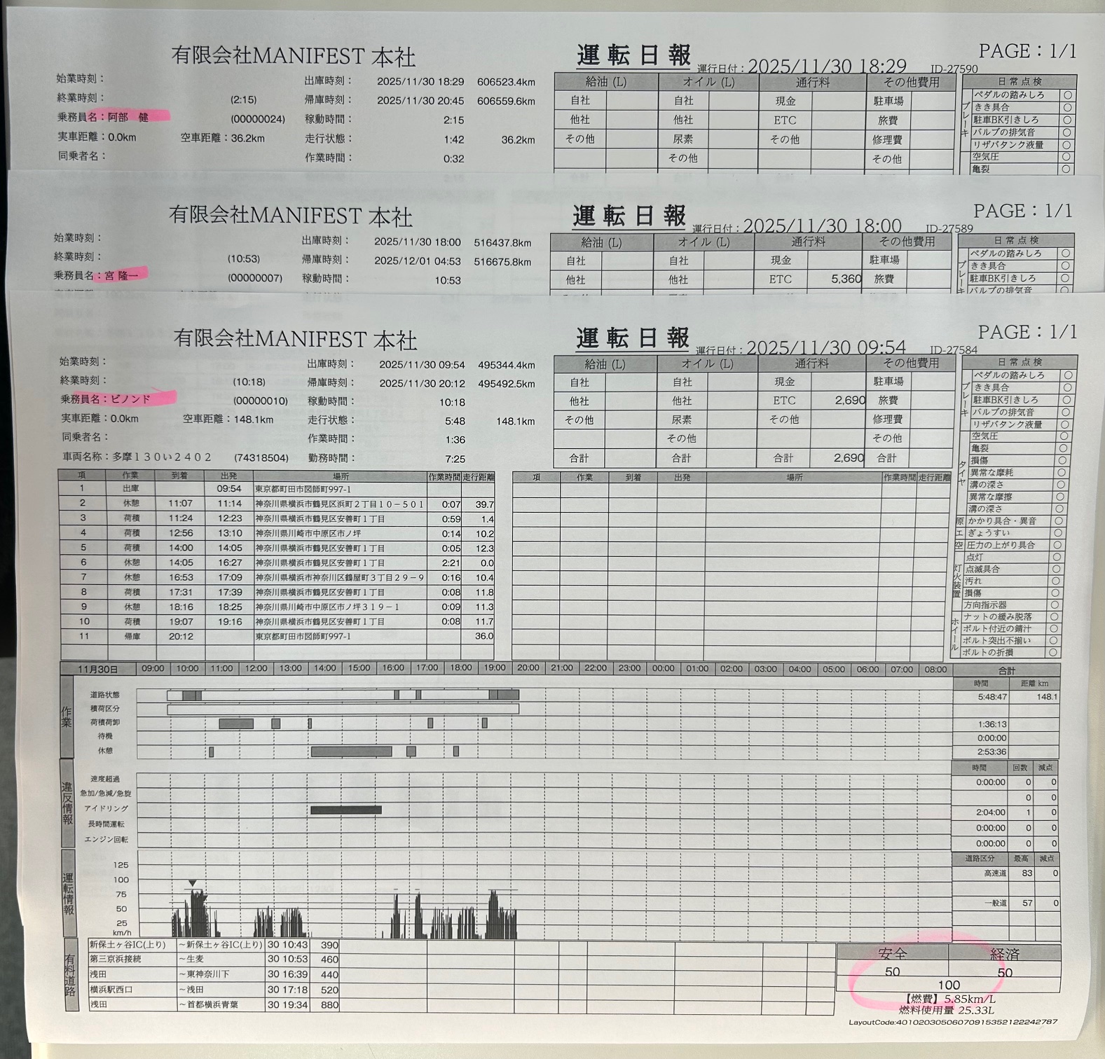 11/30分 100点満点者 3名 2025年12月1日 デジタコ(日報)お疲れ様です。3名の方が100点満点でした。いつも安全運転ありがとうございます。引き続きよろしくお願いいたします。こちらから「閲覧した」を登録してください。選択してください清和荒木宮前田ビノンド清水神山嶋村平石室矢荻野岩永荒井阿部(健)引田伊藤(諒)原甲斐碩市村山田(玲)城所阿部(長)山田(圭)庄司紀井伊藤(里)春原清和12/1荒木 宮12/2前田12/2ビノンド 清水12/1神山 嶋村 平石 室矢 荻野12/1岩永 荒井12/1阿部(健) 引田12/1伊藤(諒) 原12/1甲斐12/1碩12/2市村 山田(玲)12/1城所 阿部(長) 山田(圭) 庄司 紀井 伊藤(里)12/1春原 すべての投稿を見るトップページへ戻る