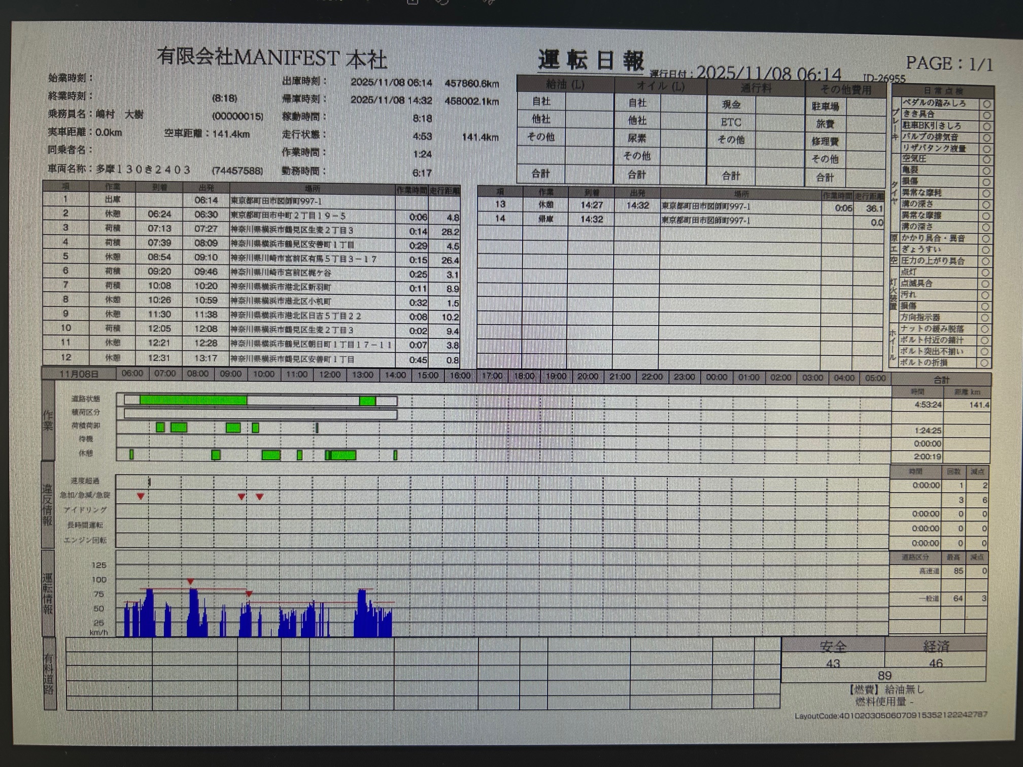 速度超過、急加速、急減速、長時間運転などに気を付け90点以上取れる安全運転で無事、帰って来れるようお願いいたします。