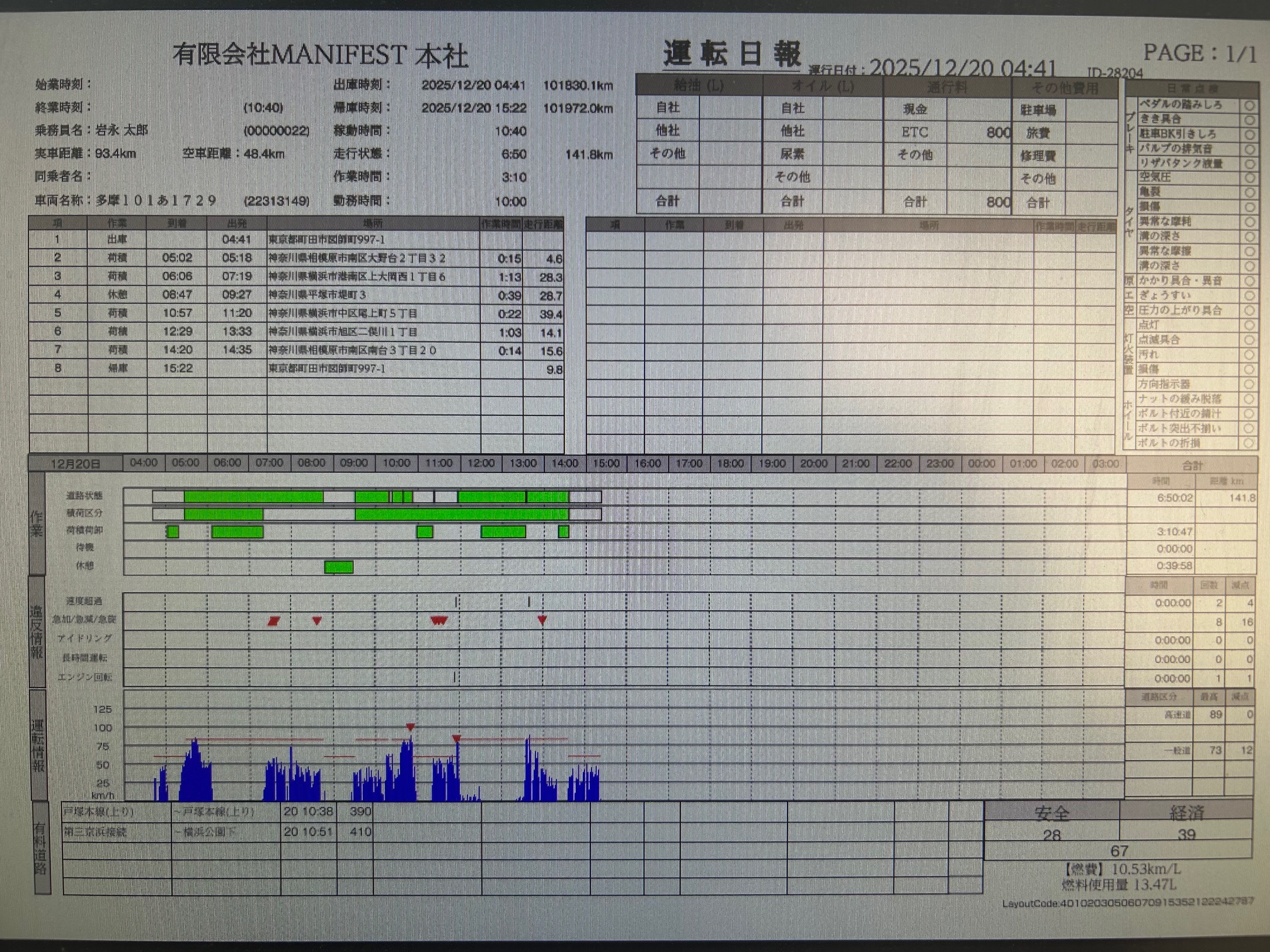 速度超過、急加速、急減速、長時間運転などに気を付け90点以上取れる安全運転で無事、帰って来れるようお願いいたします。