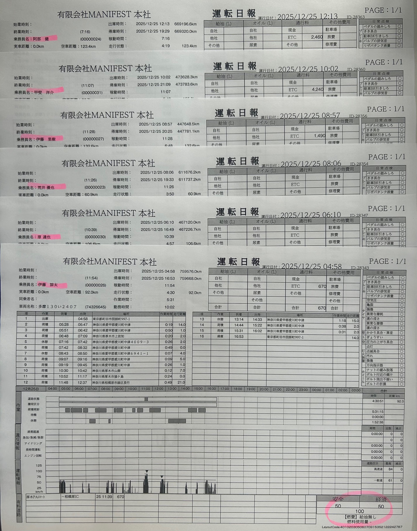 12/25分 100点満点者 6名 2025年12月26日 デジタコ(日報)お疲れ様です。6名の方が100点満点でした。いつも安全運転ありがとうございます。引き続きよろしくお願いいたします。こちらから「閲覧した」を登録してください。選択してください清和荒木宮前田ビノンド清水神山嶋村平石室矢荻野岩永荒井阿部(健)引田伊藤(諒)原甲斐碩市村山田(玲)城所阿部(長)山田(圭)庄司紀井伊藤(里)春原清和12/26荒木 宮 前田12/29ビノンド12/26清水12/26神山12/26嶋村12/26平石 室矢 荻野12/26岩永 荒井12/26阿部(健) 引田12/26伊藤(諒)12/27原12/26甲斐12/26碩 市村 山田(玲)12/27城所12/28阿部(長) 山田(圭) 庄司 紀井 伊藤(里)12/26春原 すべての投稿を見るトップページへ戻る