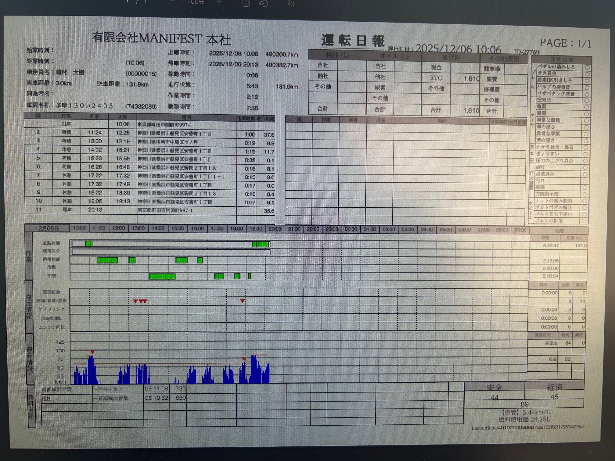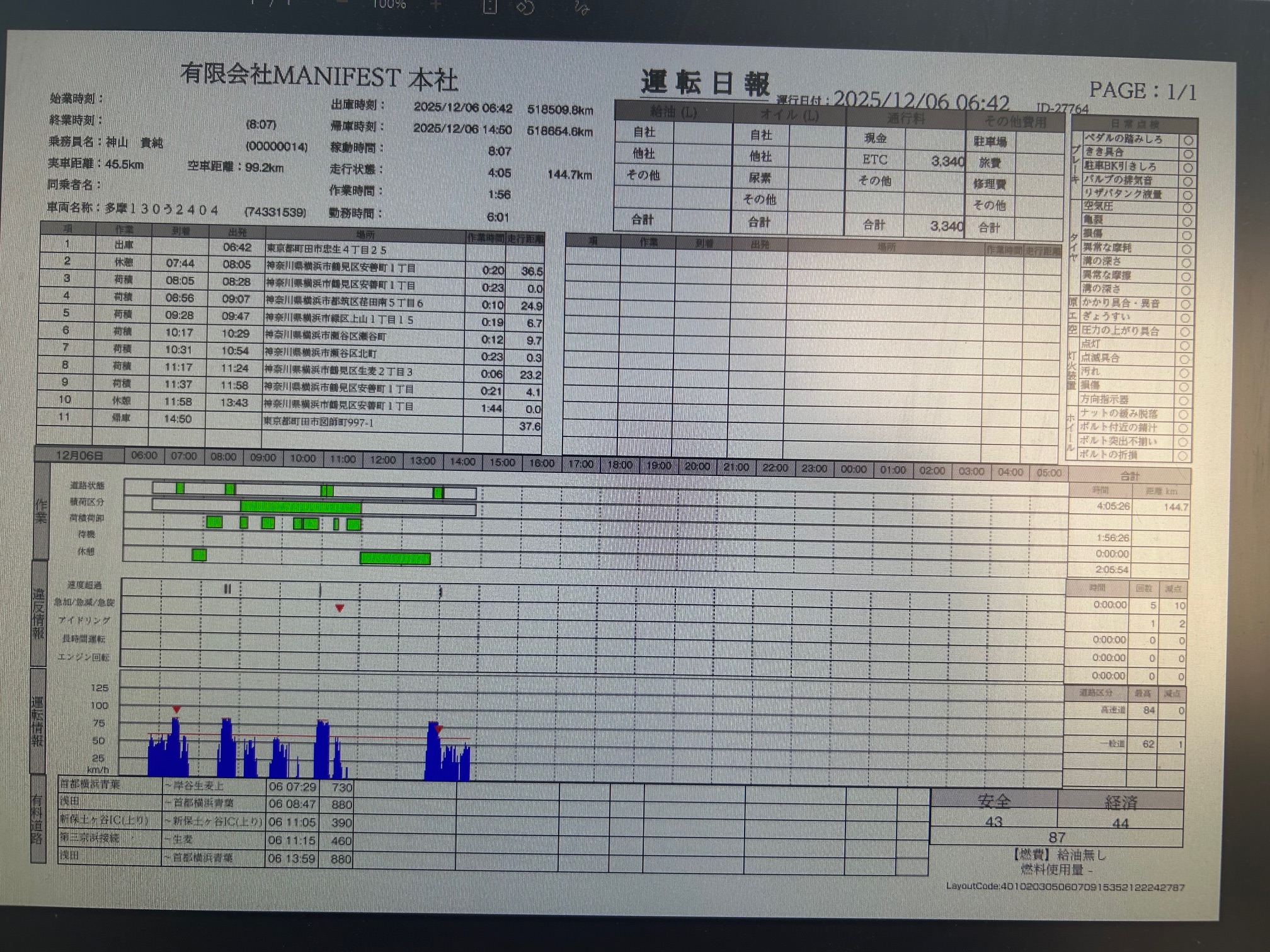 速度超過、急加速、急減速、長時間運転などに気を付け90点以上取れる安全運転で無事、帰って来れるようお願いいたします。