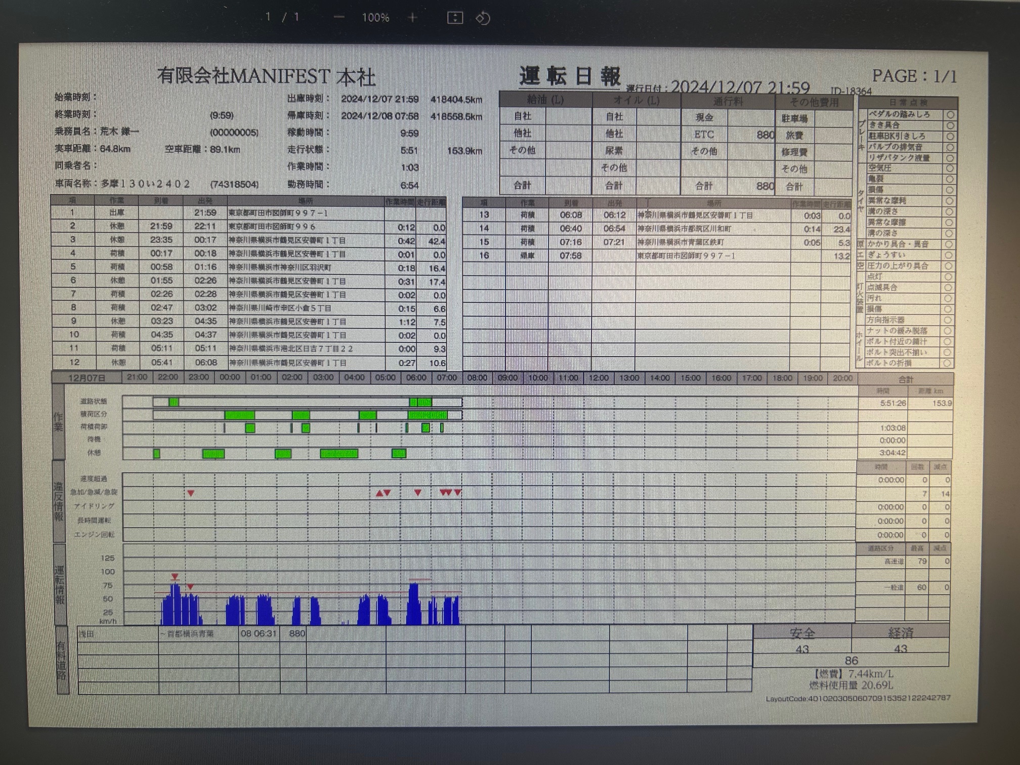 速度超過、急加速、急減速、長時間運転などに気を付け90点以上取れる安全運転で無事、帰って来れるようお願いいたします。