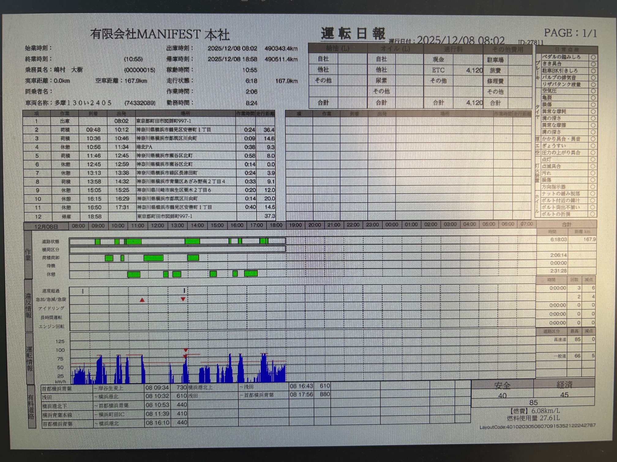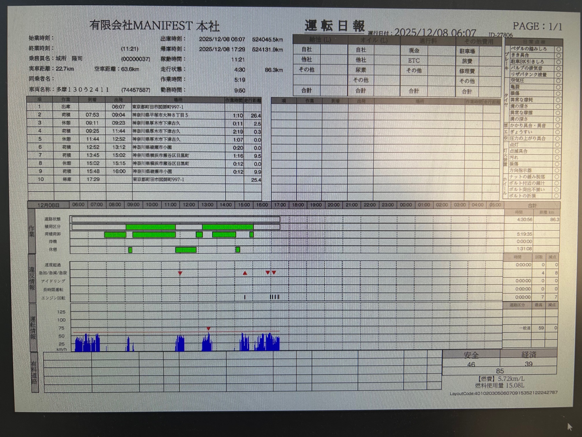 速度超過、急加速、急減速、長時間運転などに気を付け90点以上取れる安全運転で無事、帰って来れるようお願いいたします。